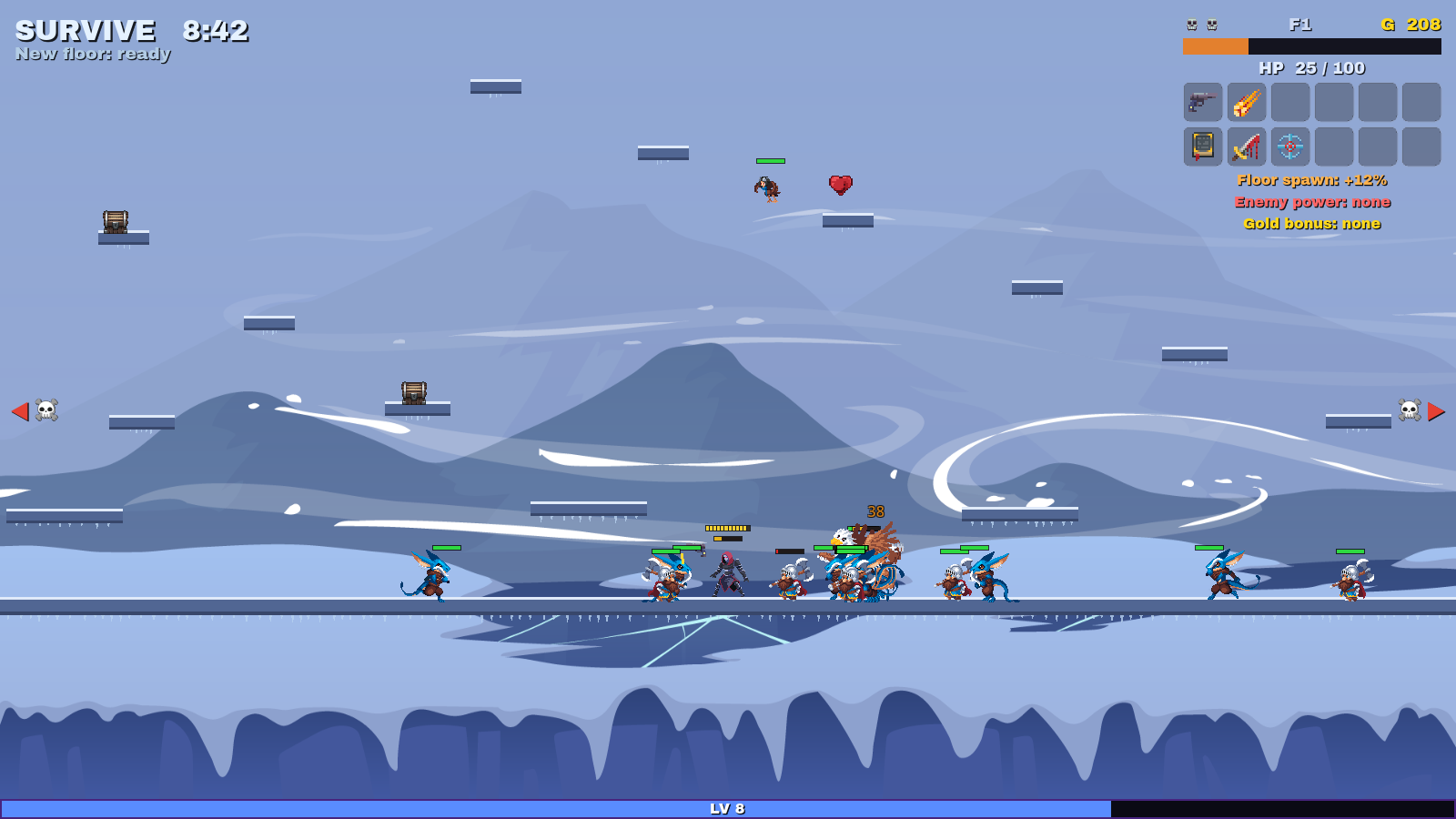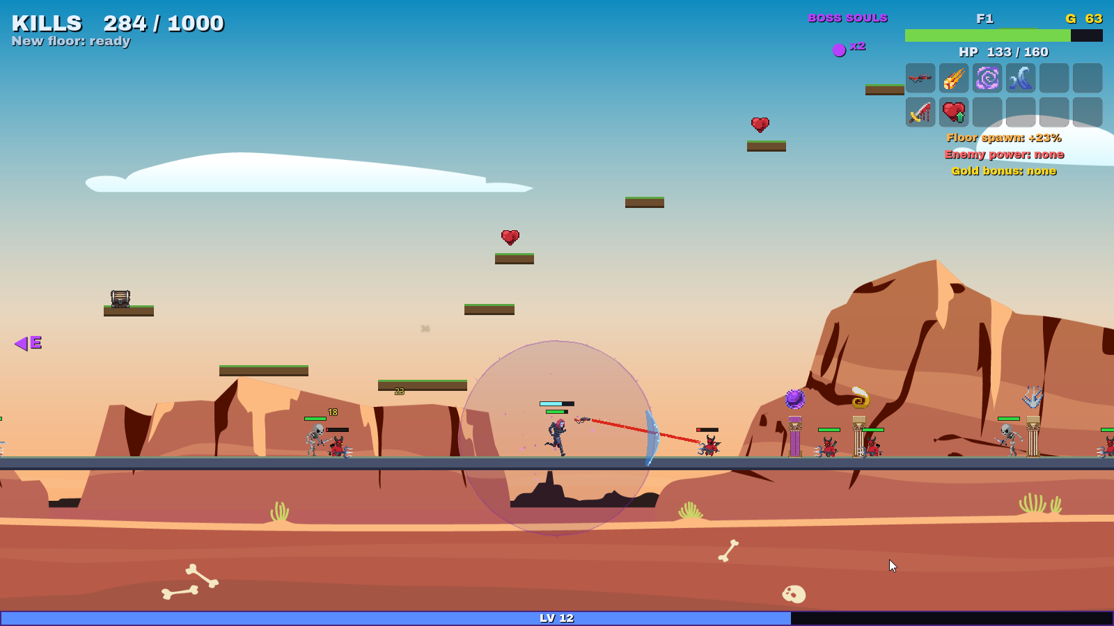 - Jump platforms to ascend to new floors with enemy stat and gold modifiers, but only if a boss isn't blocking your way